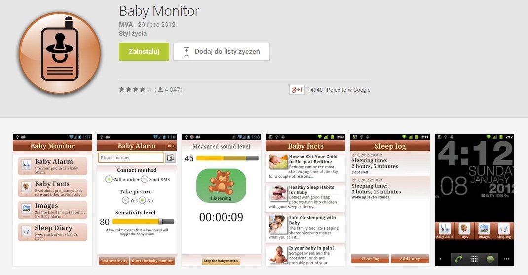 W sumie nie powinno mnie dziwić, że taka aplikacja została stworzona. Teraz już na wszystko można zrobić aplikację, więc czemu nie na nianię. Aplikacja jest banalnie prosta w obsłudze. Po wgraniu jej na telefon wystarczy wejść w opcję baby alarm, ustawić numer, pod który ma „zadzwonić” dziecko i tak naprawdę już działa. Aplikacja cały czas monitoruje poziom hałasu, więc gdy tylko dziecko zacznie płakać – nie chodzi o pojękiwania i krótki płacz podczas zmieniania pozycji, tylko o faktyczny płacz – telefon wybiera wpisany numer i dzwoni.